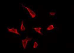 - Immunofluorescent analysis of OR5AR1 in HeLa cells. Samples were fixed with paraformaldehyde, permeabilized with 0.1% Triton X-100, blocked with 10% serum (45 min at 25°C) incubated with OR5AR1 polyclonal antibody (Product # PA5-102205) using a dilution of 1:200 (1 hr, 37°C), and followed by goat anti-rabbit IgG Alexa Fluor 594 at a dilution of 1:600.