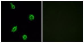 - Immunofluorescence analysis of HuvEc cells, using HTR5B Antibody. The picture on the right is treated with the synthesized peptide.