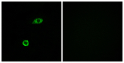 - Immunofluorescence analysis of A549 cells, using OR1B1 Antibody. The picture on the right is blocked with the synthesized peptide.
