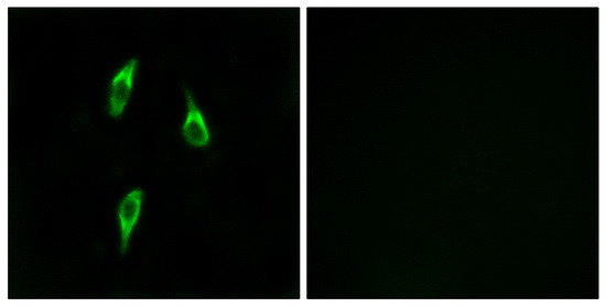 - Immunofluorescence analysis of LOVO cells, using OR51B2 antibody. The picture on the right is treated with the synthesized peptide.