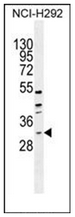 - Western blot analysis of OR51B5 Antibody (C-term) Cat.-No AP53069PU-N in NCI-H292 cell line lysates (35ug/lane). This demonstrates the OR51B5 antibody detected the OR51B5 protein (arrow)