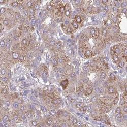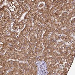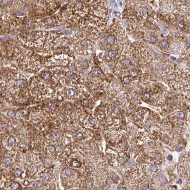- Immunohistochemical staining of FAM169B in human liver tissue shows strong cytoplasmic positivity in hepatocytes. Samples were probed using a FAM169B Polyclonal Antibody (Product # PA5-63226).