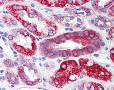 - Human Kidney (formalin-fixed, paraffin-embedded) stained with SCO2 antibody (GTX85785) at 2.5 μg/ml followed by biotinylated goat anti-rabbit IgG secondary antibody LS-D1, alkaline phosphatase-streptavidin and chromogen.