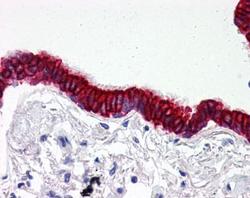 - Human Lung, Respiratory Epithelium (formalin-fixed, paraffin-embedded) stained with SCO2 antibody (GTX85785) at 2.5 μg/ml followed by biotinylated goat anti-rabbit IgG secondary antibody LS-D1, alkaline phosphatase-streptavidin and chromogen.