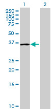 - Western Blot analysis of TFPI expression in transfected 293T cell line (H00007035-T01) by TFPI MaxPab polyclonal antibody.Lane 1: TFPI transfected lysate(33.44 KDa).Lane 2: Non-transfected lysate.