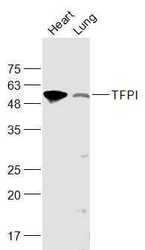 - Lane 1: Mouse Heart lysates; Lane 2: Rat Lung lysates probed with TFPI Polyclonal Antibody, Unconjugated (bs-2535R) at 1:1000 dilution and 4°C overnight incubation. Followed by conjugated secondary antibody incubation at 1:10000 for 60 min at 37°C.