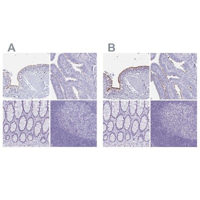 - Immunohistochemistry-Paraffin: CCDC39 Antibody [NBP2-33999] - Staining of human bronchus, fallopian tube, rectum and tonsil using Anti-CCDC39 antibody NBP2-33999 (A) shows similar protein distribution across tissues to independent antibody NBP1-90560 (B).
