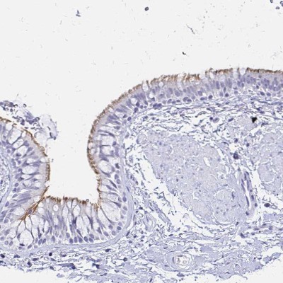- Immunohistochemistry-Paraffin: CCDC39 Antibody [NBP2-33999] - Staining of human bronchus shows moderate positivity in cilia in glandular cells.