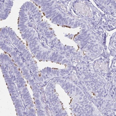 - Immunohistochemistry-Paraffin: CCDC39 Antibody [NBP2-33999] - Staining of human fallopian tube shows moderate positivity in cilia in glandular cells.