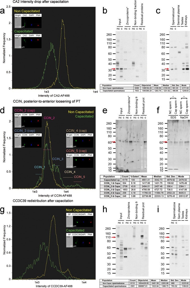 - Phenotyping of three significantly different zincoproteins between non-capacitated and IVC spermatozoa. a - c CA2, d - e CCIN, and g - i CCDC39. IBFC of formaldehyde fixed and Triton X-100 permeabilized ( a , d ) or methanol fixed/permeabilized ( g ) spermatozoa; labeled with corresponding primary antibodies. Appropriate species-specific secondary antibodies conjugated to AF488 were used and coincubated with DAPI nuclear stain and PNA-AF647 for acrosome detection. Negative controls with respective non-immune sera of matching immunoglobulin concentration were performed and were published in our previous study. IBFC was performed in 5 replicates with consistent results. WB detection in individual fractions of zincoproteome purification ( b , e , h ), and WB detection in whole sperm extracts ( c , f , i ) were employed to fully characterize the capacitation changes in the studied proteins. The red arrows point to the bands of actual (CA2 ~ 32 kDa, CCIN ~ 60 kDa), and predicted (CCDC39 ~ 110 kDa) molecular weights.WB detection in sperm zincoproteome ( b , e , h ) and the whole sperm extracts ( c , f , i ) was performed in 8 replicates, and 3 replicates respectively. A statistically significant difference ( P < 0.05, two-sample t -test) between non-capacitated and capacitated spermatozoa is indicated by an asterisk.