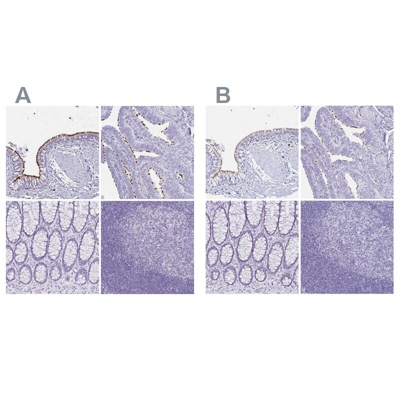 - Immunohistochemical staining of CCDC39 in human bronchus, fallopian tube, rectum and tonsil using CCDC39 Polyclonal Antibody (Product # PA5-57243) (A) shows similar protein distribution across tissues to an independent CCDC39 Polyclonal Antibody (B).