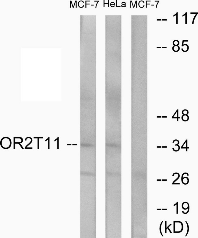 - Western blot analysis of lysates from MCF-7 and HeLa cells, using OR2T11 Antibody. The lane on the right is blocked with the synthesized peptide.