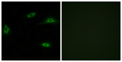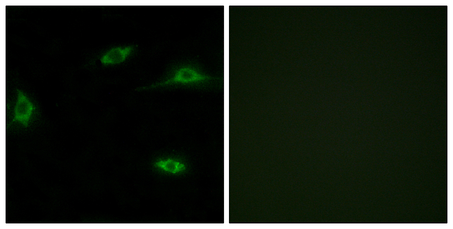 - Immunofluorescence analysis of LOVO cells, using OR2T11 Antibody. The picture on the right is blocked with the synthesized peptide.