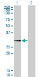- Western Blot: PPP1R2P3 Antibody (2G11) [H00153743-M01] - Analysis of PPP1R2P3 expression in transfected 293T cell line by PPP1R2P3 monoclonal antibody (M01), clone 2G11.Lane 1: PPP1R2P3 transfected lysate(23 KDa).Lane 2: Non-transfected lysate.
