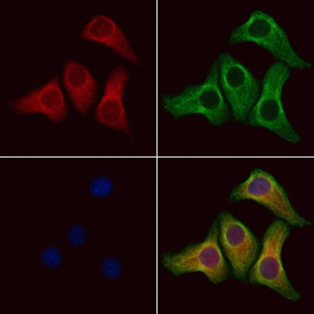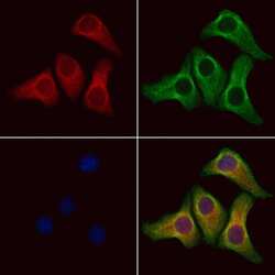 - Immunofluorescent analysis of PPP1R2P3 in HeLa cells. Samples were fixed with paraformaldehyde, permeabilized with 0.1% Triton X-100, blocked with 10% serum (45 min at 25°C), incubated with mouse anti-beta tubulin and PPP1R2P3 polyclonal antibody (Product # PA5-104041) using a dilution of 1:200 (1 hr, 37°C), and followed by goat anti-rabbit IgG Alexa Fluor 594 (red) and goat anti-mouse IgG Alexa Fluor 488 (green).