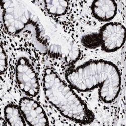 - Immunohistochemical staining of human rectum shows strong nuclear positivity in glandular cells.