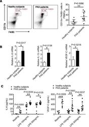 - Fig. 2 Blood monocytes in PAS patients produce inflammatory cytokines and VEGF-C. a PBMCs were isolated from blood of 8 healthy subjects and 9 PAS patients by density-gradient centrifugation with Ficoll (1.077), followed by staining with FITC-conjugated anti-CD11b and APC-conjugated anti-F4/80 for flow cytometer analysis. b Relative mRNA levels IL-6, VEGF-C or IL-1beta in PBMCs from healthy subjects and PAS patients were tested with qRT-PCR. c Freshly isolated monocytes from healthy subjects and PAS patients were either untreated (n = 6) or stimulated with different doses of LPS for 24 h (n = 10), followed by detection of IL-6 and VEGF-C concentrations from the supernatants by ELISA. Data presented are representative of three replicated experiments