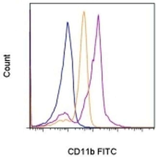 - Staining of 5-minute PMA/Ionomycin-stimulated normal human peripheral blood cells with Mouse IgG1 K Isotype Control FITC (Product # 11-4714-42) (blue histogram) or Anti-Human CD11b (activation epitope) FITC (purple histogram). The orange histogram depicts staining of unstimulated cells with the Anti-Human CD11b (activation epitope) FITC antibody. Cells in the granulocyte gate were used for analysis.