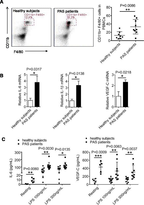 - Fig. 2 Blood monocytes in PAS patients produce inflammatory cytokines and VEGF-C. a PBMCs were isolated from blood of 8 healthy subjects and 9 PAS patients by density-gradient centrifugation with Ficoll (1.077), followed by staining with FITC-conjugated anti-CD11b and APC-conjugated anti-F4/80 for flow cytometer analysis. b Relative mRNA levels IL-6, VEGF-C or IL-1beta in PBMCs from healthy subjects and PAS patients were tested with qRT-PCR. c Freshly isolated monocytes from healthy subjects and PAS patients were either untreated (n = 6) or stimulated with different doses of LPS for 24 h (n = 10), followed by detection of IL-6 and VEGF-C concentrations from the supernatants by ELISA. Data presented are representative of three replicated experiments