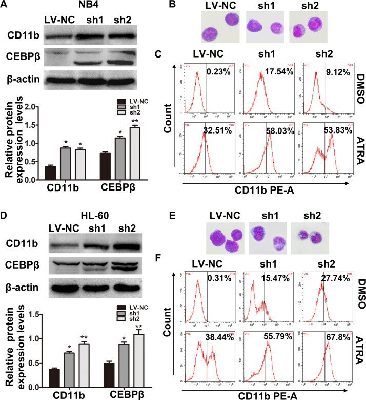 - Figure 4 Downregulation of RREB1 enhances differentiation of NB4 and HL-60 cells. (A) The protein levels of CD11b and CEBPbeta in NB4 (A) and HL-60 (D) cells were examined by Western blot. Representative Wright-Giemsa staining images showed the change in cell morphology in NB4 (B) and HL-60 (E) cells. Original magnification: 100x. The CD11b + cells in NB4 (C) and HL-60 (F) cells were analyzed by flow cytometry. * p < 0.05, ** p < 0.01, compared with LV-NC.