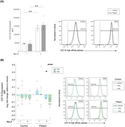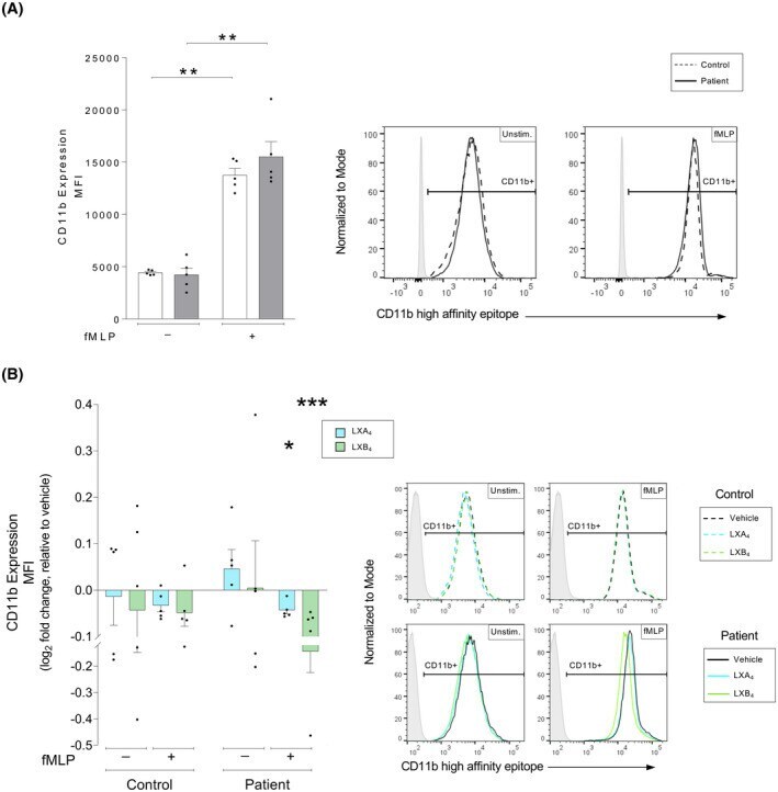 - FIGURE 4 Lipoxin-mediated changes to the high-affinity conformation of the CD11b receptor in human neutrophils from patients with atherosclerosis versus healthy controls. Whole blood from healthy controls ( n = 5) or patients with atherosclerosis ( n = 5) was exposed to inflammatory stimulus as indicated, either in the absence or presence of lipoxin A 4 (LXA 4 : 500 nM) or lipoxin B 4 (LXB 4 : 500 nM). Neutrophil expression of the CD11b high-affinity conformation was measured by flow cytometry. (A) Neutrophil expression of the CD11b high-affinity conformation was measured as the cellular mean fluorescence intensity (MFI). The expression was measured in controls (white bars) and patients (gray bars). The cells were untreated (Unstim.) or stimulated with chemotactic peptide N-formyl-Met-Leu-Phe (fMLP, 0.4 muM). Representative MFI histograms for CD11b expression and respective conditions are shown for controls (dashed line) and patients (solid line), where the gates were determined using a negative population (gray shaded peaks). (B) LXA 4 (blue bars) and LXB 4 (green greens)-induced changes to the neutrophil expression of the CD11b high-affinity conformation was calculated as the log 2 fold change relative to respective vehicle-treated condition. The samples were stimulated as indicated. The bar graphs show levels of cellular CD11b MFI. Representative histograms for the expression of CD11b and respective conditions are shown for vehicle (black line), LXA 4 (blue line), and LXB