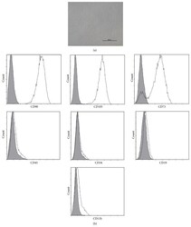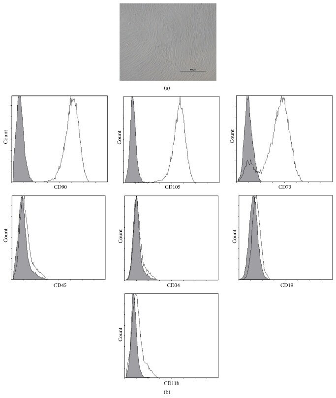 - Figure 1 Characteristics of BM-MSCs. (a) Representative morphology of BM-MSCs. Scale bar = 500 mu m. (b) Representative flow cytometric characterization of cell surface markers expressed on BM-MSCs. Isotypic controls were represented by the gray filled histograms.