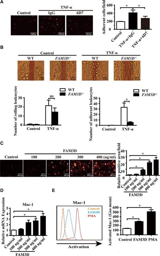 - Figure 5. FAM3D (family with sequence similarity 3, member D) induces neutrophil adhesion and transmigration and activates Mac-1 (macrophage-1 antigen) in neutrophils. A , Representative photographs and quantification of the adhesion of DiI-labeled neutrophils to human umbilical vein endothelial cells (HUVECs) after coculture in the absence or presence of FAM3D neutralization antibody 6D7 (20 mumol/L) or an equal amount of mouse IgG for 2 hours. HUVEC monolayers were stimulated with 4 ng/mL TNF-alpha (tumor necrosis factor alpha) for 24 hours prior to coculture. n=12. One-way analysis of variance (ANOVA) followed by Tukey's test for multiple comparisons, * P