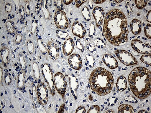 - Immunohistochemical staining of paraffin-embedded human Kidney tissue within the normal limits using anti-NFKBIE mouse monoclonal antibody. (Heat-induced epitope retrieval by 1mM EDTA in 10mM Tris buffer (pH8.5) at 120°C for 3 min, TA810713)(1:500).