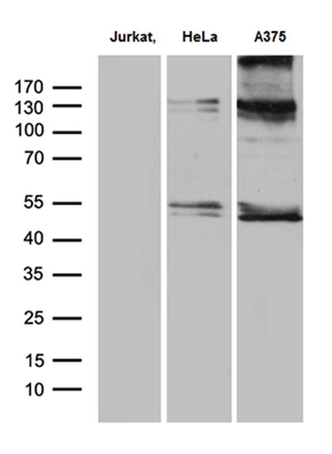 - Western blot analysis of extracts (35 µg) from 3 different cell lines by using anti-NFKBIE monoclonal antibody. (1:500)