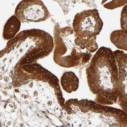 - Immunohistochemical staining of human placenta shows strong cytoplasmic positivity in trophoblastic cells.