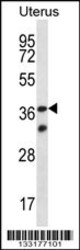 - OR4X2 Antibody (C-term) (Cat. #AP13266b) western blot analysis in human normal Uterus tissue lysates (35ug/lane).This demonstrates the OR4X2 antibody detected the OR4X2 protein (arrow).