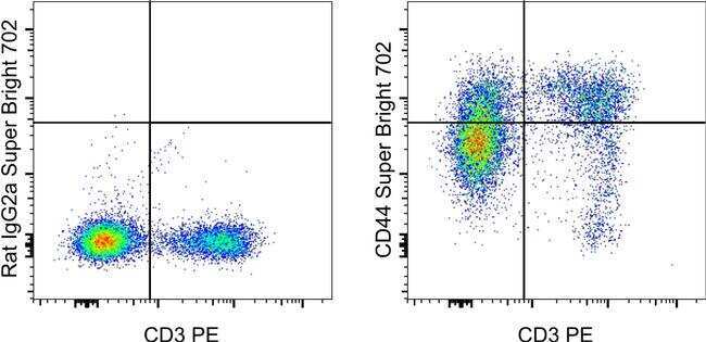 - Description: The IM7 monoclonal antibody reacts with all isoforms of mouse CD44 (Pgp-1). CD44 is expressed by hematopoietic and non-hematopoietic cells. Bone marrow myeloid cells and memory T cells highly express this antigen and peripheral B and T cells can upregulate the expression of CD44. CD44 functions as an adhesion molecule through its binding to hyaluronate, an extracellular matrix component. Applications Reported: This IM7 antibody has been reported for use in flow cytometric analysis. Applications Tested: This IM7 antibody has been tested by flow cytometric analysis of mouse splenocytes. This may be used at less than or equal to 1.0 µg per test. A test is defined as the amount (µg) of antibody that will stain a cell sample in a final volume of 100 µL. Cell number should be determined empirically but can range from 10^5 to 10^8 cells/test. It is recommended that the antibody be carefully titrated for optimal performance in the assay of interest. Super Bright 645 is a tandem dye that can be excited with the violet laser line (405 nm) and emits at 645 nm. We recommend using a 660/20 bandpass filter. Please make sure that your instrument is capable of detecting this fluorochrome. When using two or more Super Bright dye-conjugated antibodies in a staining panel, it is recommended to use Super Bright Complete Staining Buffer (Product # SB-4401) to minimize any non-specific polymer interactions. Please refer to the datasheet for Super Bright Staining Buffer for more information. Light sensitivity: This tandem dye is sensitive to photo-induced oxidation. Please protect this vial and stained samples from light. Fixation: Samples can be stored in IC Fixation Buffer (Product # 00-8222) (100 µL of cell sample + 100 µL of IC Fixation Buffer) or 1-step Fix/Lyse Solution (Product # 00-5333) for up to 3 days in the dark at 4°C with minimal impact on brightness and FRET efficiency/compensation. Some generalizations regarding fluorophore performance after fixation can be made, but clone specific performance should be determined empirically. Excitation: 405 nm; Emission: 645 nm; Laser: Violet Laser Super Bright Polymer Dyes are sold under license from Becton, Dickinson and Company.