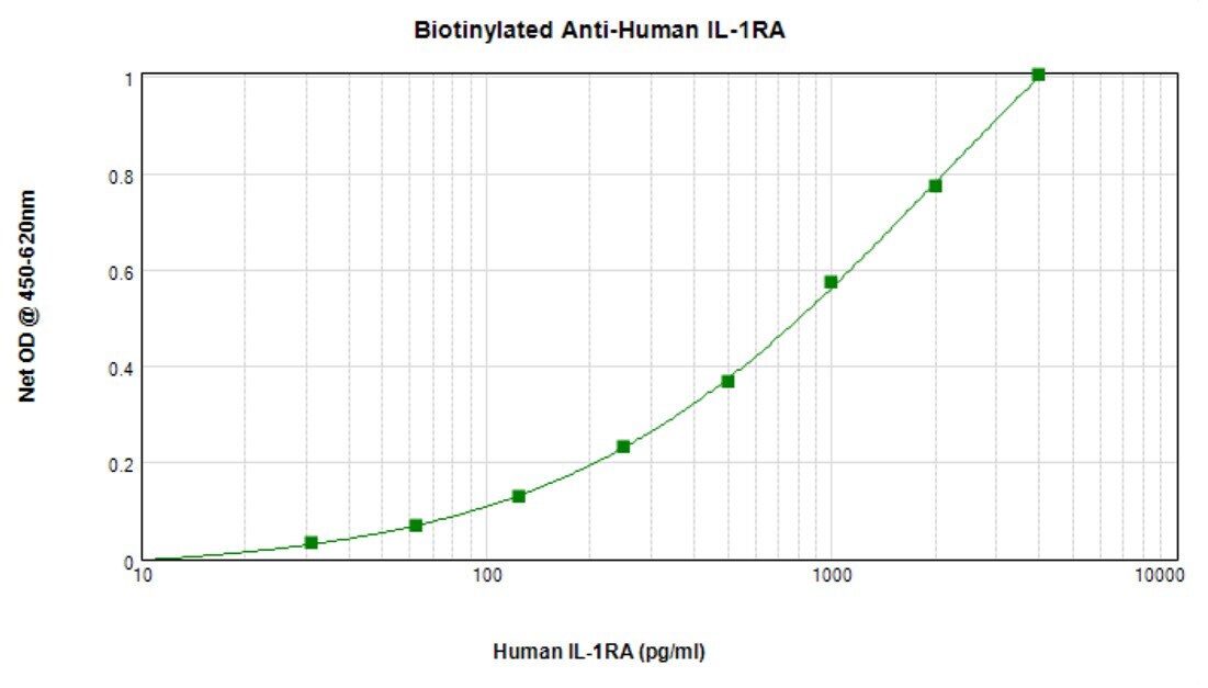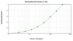 - Sandwich ELISA: To detect Human IL-1RA by sandwich ELISA (using 100 µL/well antibody solution) a concentration of 0.25-1.0 µg/mL of IL1RA Polyclonal Antibody, Biotin (Product # 500-P209BT-1MG) is required. This biotinylated polyclonal antibody, in conjunction with PeproTech IL1RA Polyclonal Antibody (Product # 500-P209-1MG) as a capture antibody, allows the detection of at least 0.2-0.4 ng/well of Recombinant Human IL-1RA.