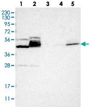 - Western blot analysis of Lane 1: RT-4, Lane 2: U-251 MG, Lane 3: Human Plasma, Lane 4: Liver, Lane 5: Tonsil with C5orf4 polyclonal antibody (Cat # PAB20766) at 1:250-1:500 dilution.