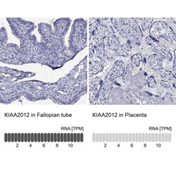- Immunohistochemical analysis of KIAA2012 in human fallopian tube and placenta tissues using KIAA2012 Polyclonal Antibody (Product # PA5-140350) using Anti-KIAA2012 antibody. Corresponding KIAA2012 RNA-seq data are presented for the same tissues.