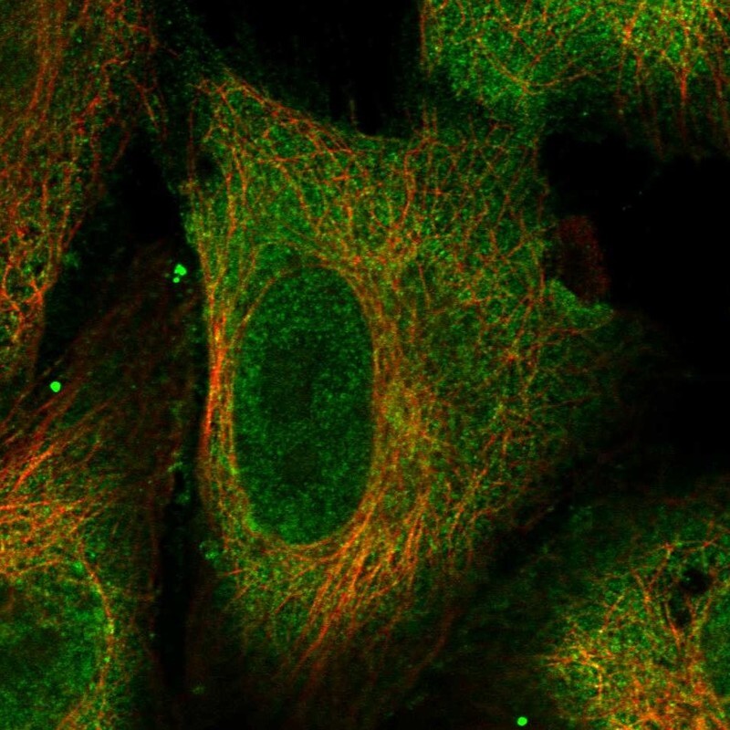 - Immunofluorescent staining of human cell line GAMG shows localization to nucleoplasm & plasma membrane.