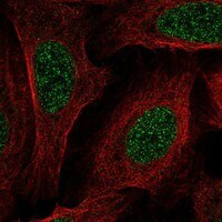 - Immunofluorecent analysis of TMEM233 in human cell line U-2 OS using TMEM233 Polyclonal Antibody (Product # PA5-140334). Staining shows localization to nucleoplasm.