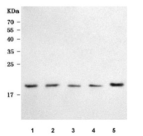 - Western blot testing of 1) human SH-SY5Y, 2) human U251, 3) human HepG2, 4) human Caco-2 and 5) rat C6 cell lysate with PMIS2 antibody. Predicted molecular weight ~16 kDa.