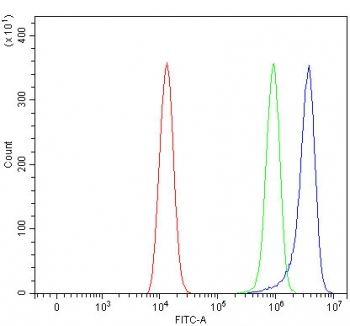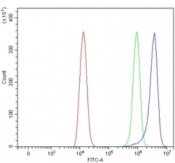 - Flow cytometry testing of human HEL cells with RAB44 antibody at 1ug/million cells (blocked with goat sera); Red=cells alone, Green=isotype control, Blue= RAB44 antibody.