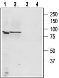 - Western blot analysis of rat brain membranes: 1. Anti-TRPC4 antibody, (1:200). 2. Anti-TRPC4 antibody, preincubated with the control peptide antigen.