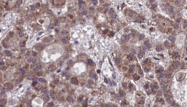 - 1:100 staining human liver carcinoma tissues by IHC-P. The sample was formaldehyde fixed and a heat mediated antigen retrieval step in citrate buffer was performed. The sample was then blocked and incubated with the antibody for 1.5 hours at 22°C. An HRP conjugated goat anti-rabbit antibody was used as the secondary.