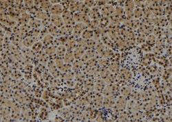 - 1:100 staining mouse kidney tissue by IHC-P. The sample was formaldehyde fixed and a heat mediated antigen retrieval step in citrate buffer was performed. The sample was then blocked and incubated with the antibody for 1.5 hours at 22°C. An HRP conjugated goat anti-rabbit antibody was used as the secondary.