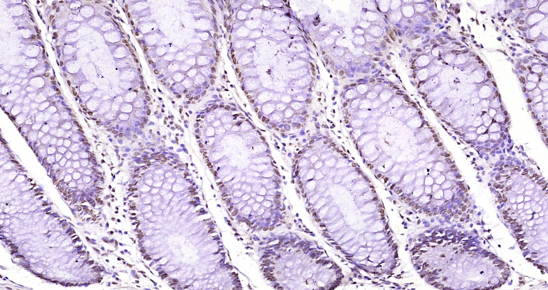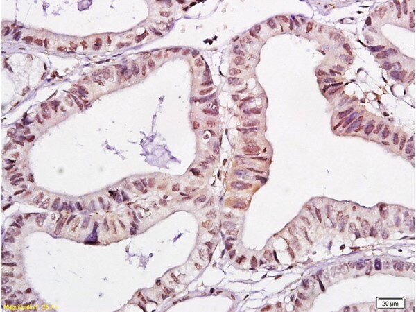 - Paraformaldehyde-fixed, paraffin embedded Human colon cancer; Antigen retrieval by boiling in sodium citrate buffer (pH6.0) for 15min; Block endogenous peroxidase by 3% hydrogen peroxide for 20 minutes; Blocking buffer (normal goat serum) at 37°C for 30min; Antibody incubation with WWOX Polyclonal Antibody, Unconjugated (bs-0589R) at 1:200 overnight at 4°C, DAB staining.