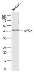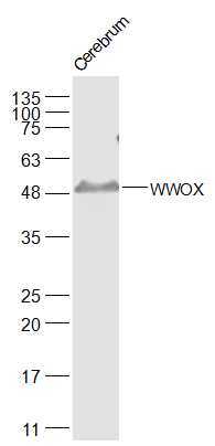 - Mouse cerebrum lysates probed with WWOX Polyclonal Antibody, Unconjugated (bs-0589R) at 1:500 dilution and 4°C overnight incubation. Followed by conjugated secondary antibody incubation at 1:10000 for 60 min at 37°C.