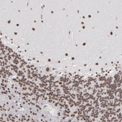 - Immunohistochemistry-Paraffin: ZNF3 Antibody [NBP1-89329] - Staining of human cerebellum shows nuclear positivity in Purkinje cells, as well as in the molecular and granular cell layers.