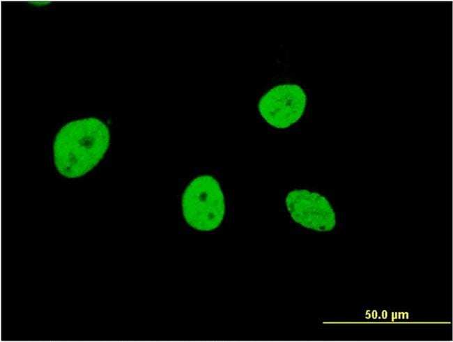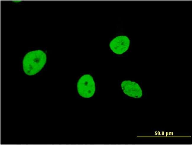 - Immunofluorescent analysis of NOL4 in HeLa cell lysates. Samples were probed using a Mouse Monoclonal NOL4 (2A10) Antibody (Product # MA5-24429) at 10 µg/mL.