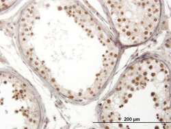 - Immunohistochemical analysis of NOL4 in formalin-fixed paraffin-embedded human testis tissue. Samples were probed using a Mouse Monoclonal NOL4 (2A10) Antibody (Product # MA5-24429) at 3 µg/mL.