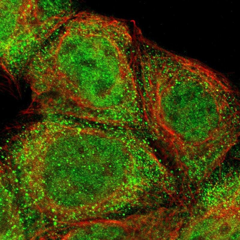 - Immunofluorescent staining of human cell line A-431 shows localization to nucleoplasm & cytosol.