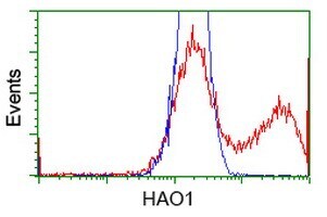 - HEK293T cells transfected with either RC216834 overexpress plasmid (Red) or empty vector control plasmid (Blue) were immunostained by anti-HAO1 antibody (TA502105), and then analyzed by flow cytometry.