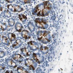 - Immunohistochemical staining of human duodenum shows strong cytoplasmic positivity in glandular cells.